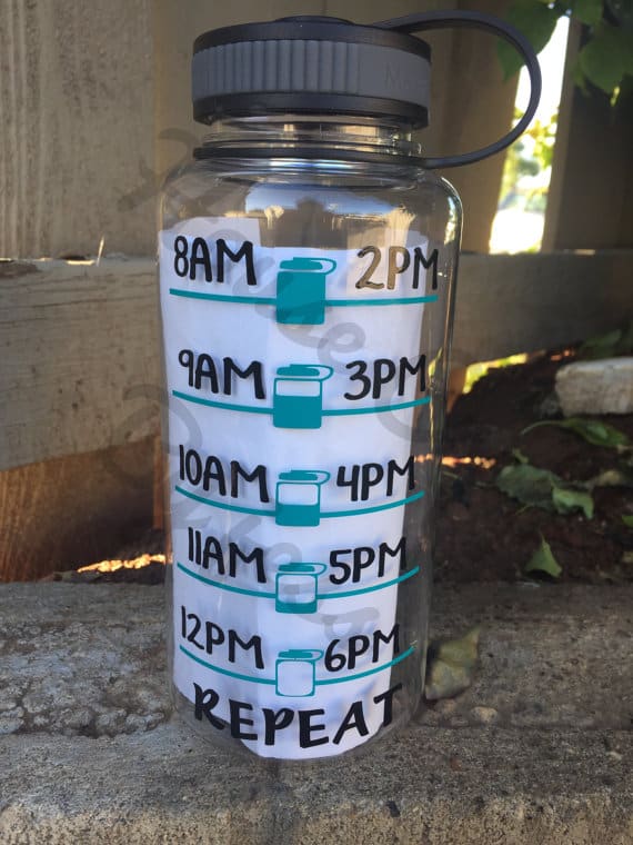 Another clever idea is to get a large clear reusable water bottle and draw lines on the side indicating each cup’s worth of water. That way, you can visibly see how much water you’ve been drinking throughout the day and start making it a goal to drink a certain amount by a certain time.