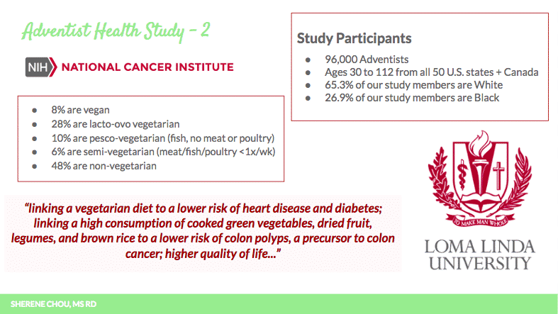 The benefits of a plant-based diet are based on the Adventist Health Study, which included over 96,000 Seventh-day Adventists, ages 30 to 112, from all fifty states and from Canada. About 8% were vegan, 20% were lacto-ovo vegetarian, which means they don’t eat meat but do eat dairy and eggs. 10% were pesco-vegetarian, a diet which includes fish but excludes meat and poultry, and 48% were non-vegetarian, which basically means they ate meat.
