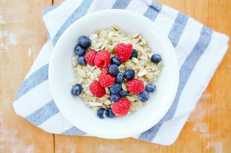 Quinoa is a wonderful, wonderful seed and a complete protein, which means it contains all nine essential amino acids. Most people tend to add quinoa to a savory lunch or dinner meal but we’re turning that on its head by combining it with sweet ingredients for a healthy breakfast.