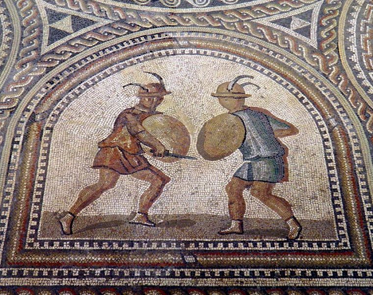 Imagine a group of gladiators eating dinner. What do you see? Your brain probably conjures up images of men with big knives sitting around a large wooden table. Dinner is a pig…