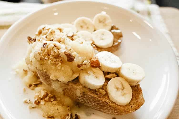 Once toast is ready, spread ½ tablespoon of almond butter on each slice, layering banana slices on top and spooning on applesauce. Garnish with nuts for an added crunch.