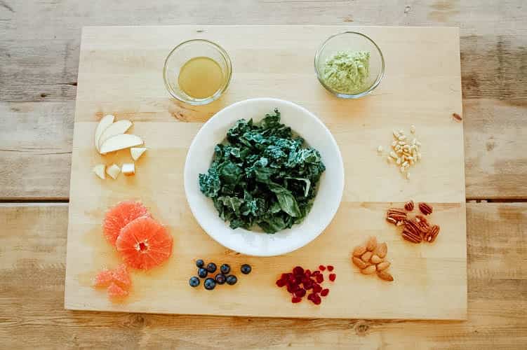 Mix the dressing with the kale, along with any additional ingredients such asveggies, fresh or dried fruits, and nuts.