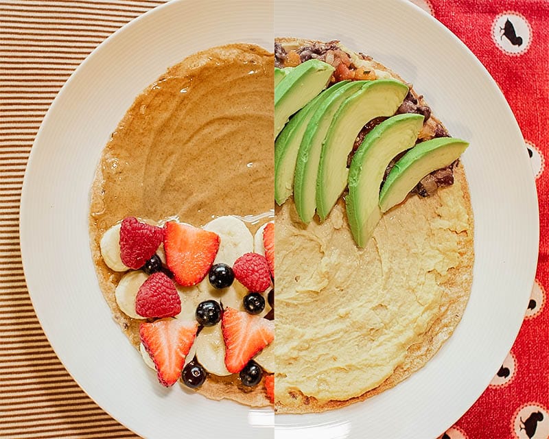 Begin by spreading the base (almond butter or hummus) on the entire tortilla, then layer the rest of the sweet or savory ingredients onto half the tortilla.